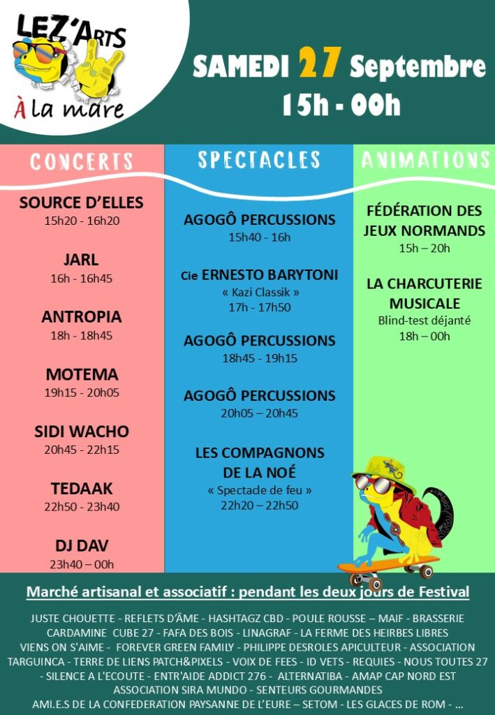 Le festival des Lez’arts à la mare, ça vous tente mais vous pouvez pas vous déplacer ou vous n’osez pas y aller en solo ? Tadam, on propose de vous y emmener ou vous y retrouver samedi 27, une belle occaz’ de faire des découvertes, des rencontres. Infos et inscriptions au 02.32.30.23.15.
